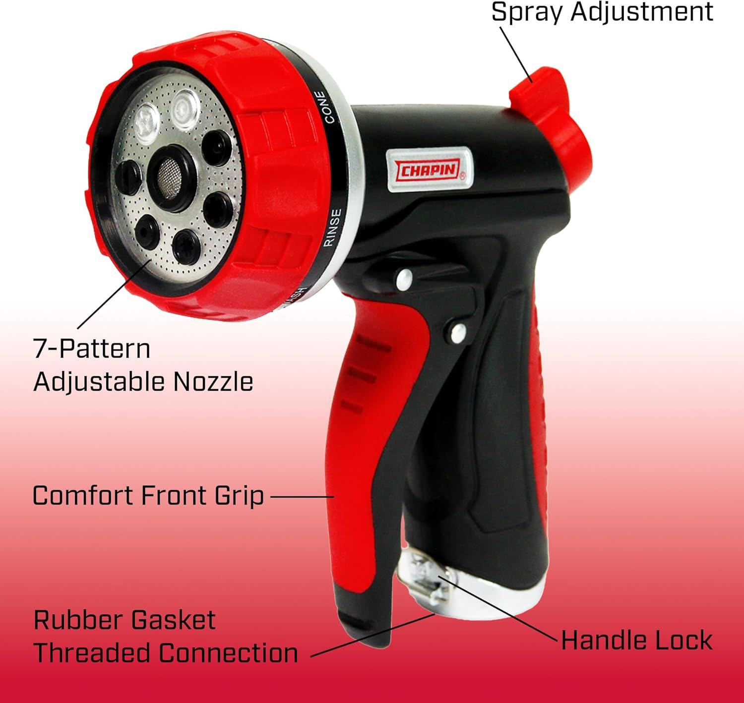 Chapin 4605: 7-Pattern Garden Hose Spray Nozzle with Front Trigger Grip, Threaded Connection Fits Standard Garden Hose, for Gardening, Landscaping, Watering and Outdoor Jobs, Red/Black(Front Trigger Grip)