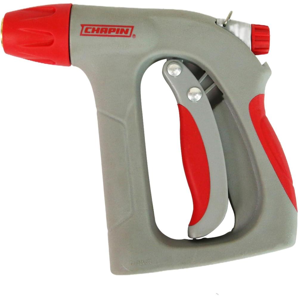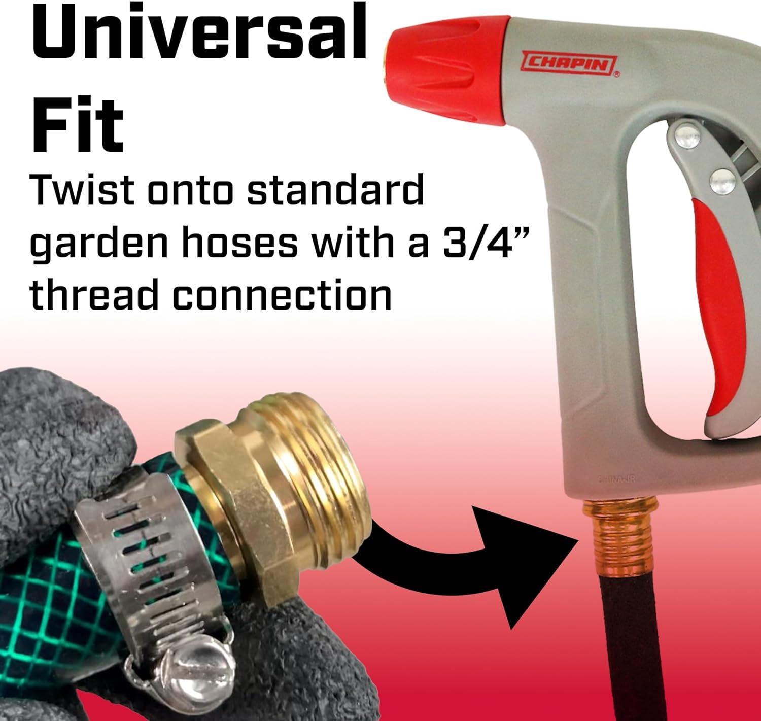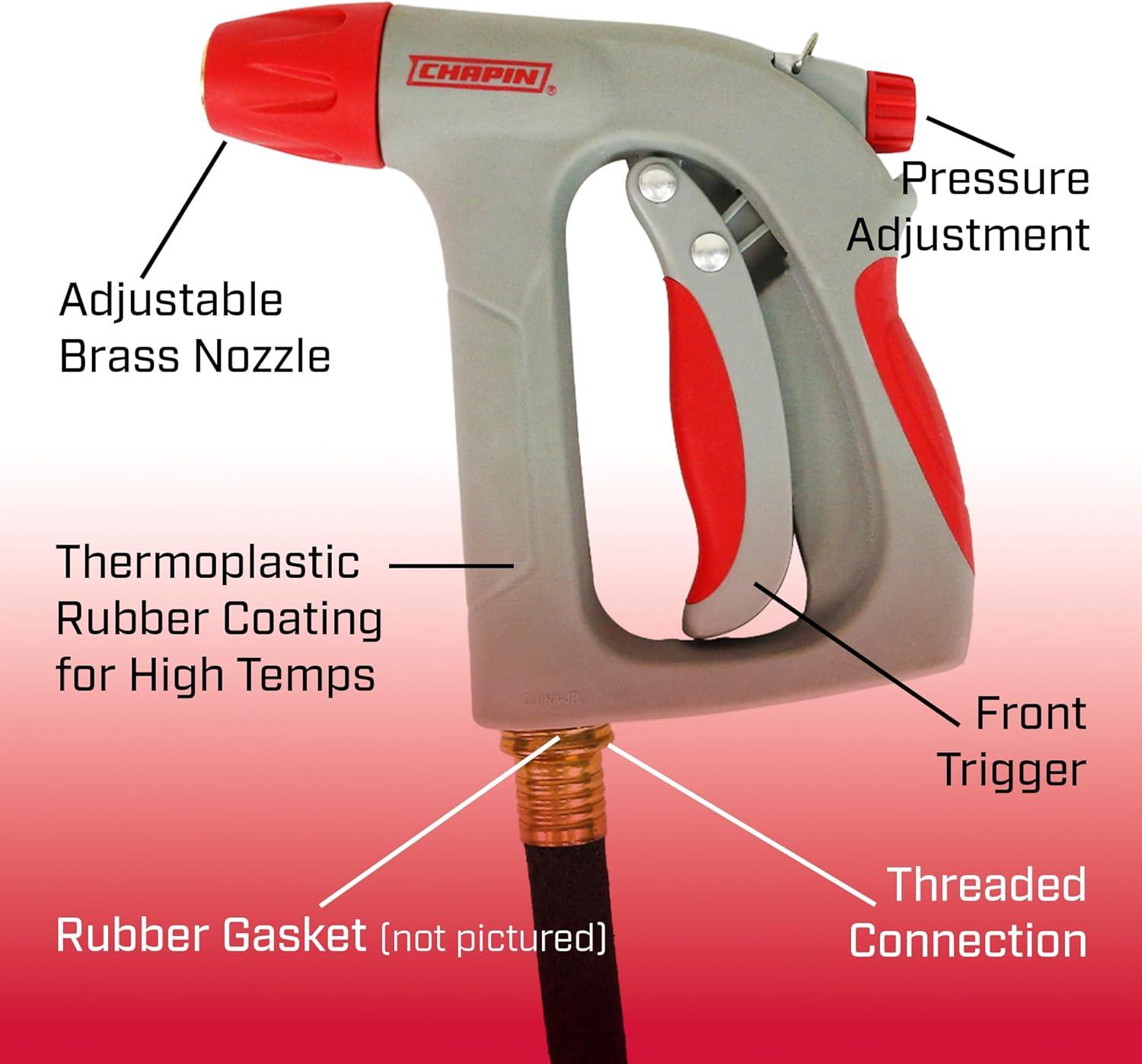 Cleaning, watering and high-pressure landscaping tasks are easier with Chapin’s 4693 high temp, high pressure spray nozzle. The rear trigger, ergonomic pistol grip is comfortable to hold on to and you don’t need to constantly grip the trigger to spray with the trigger lock. Thermoplastic rubber coats the durable zinc body and it handles up to 160°F water. Spray a straight stream with the zinc nozzle and up to 100 PSI of water pressure. Fits general hoses with a threaded connection. Genuine Chapin irrigation accessory and backed by a 1-year limited warranty.