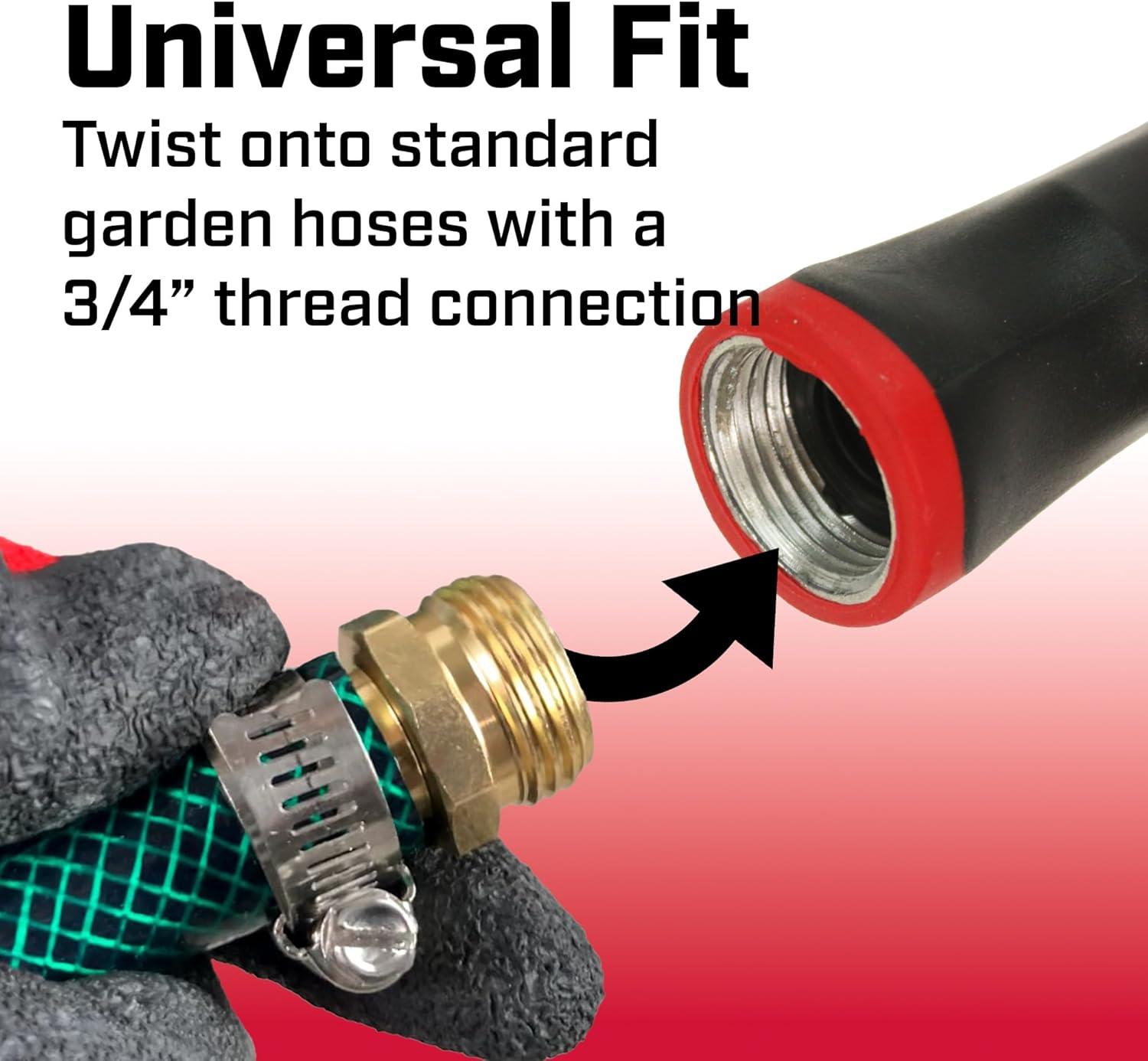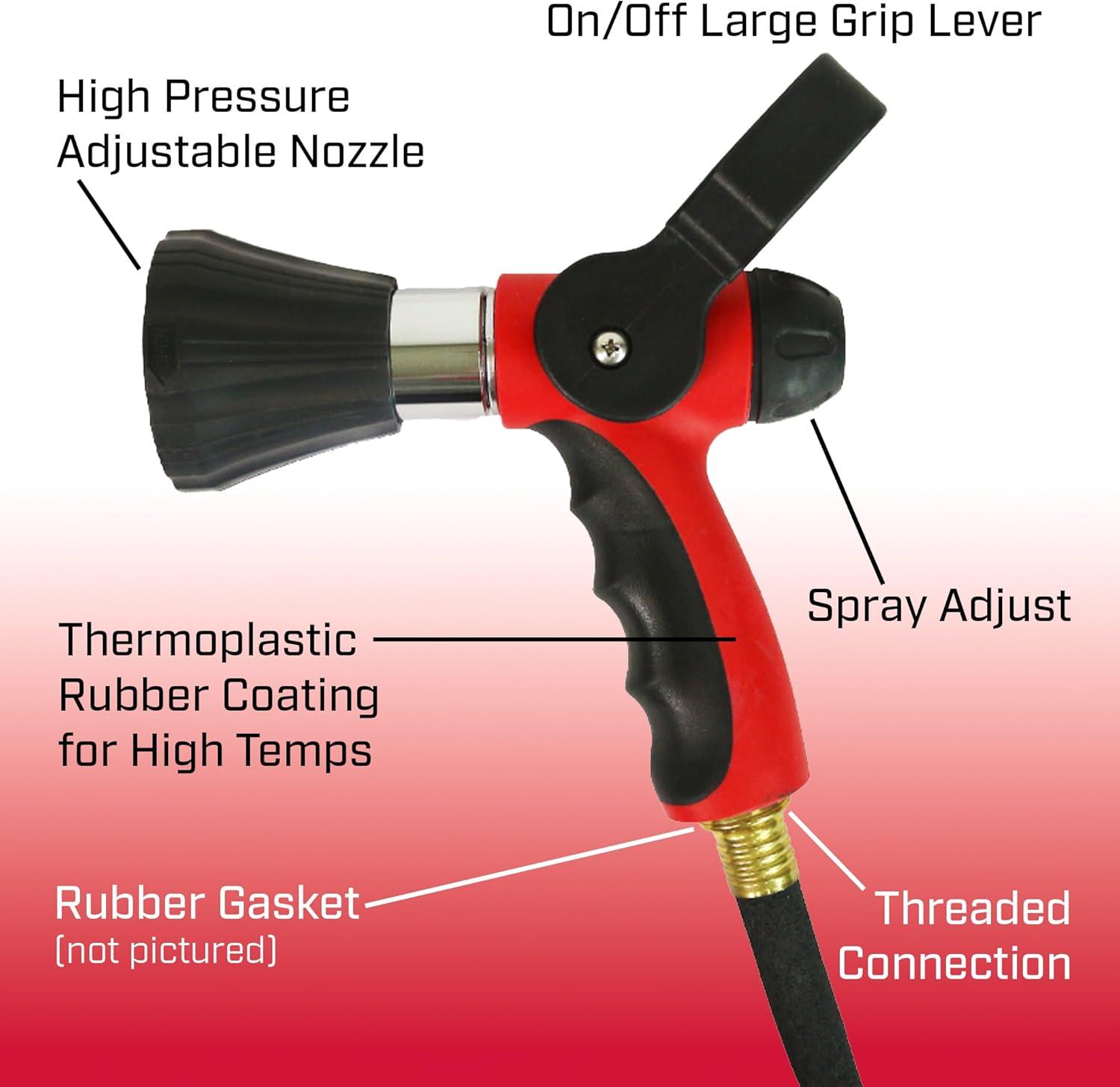 DURABLE CONSTRUCTION: heavy-duty thermoplastic rubber coated zinc construction and zinc nozzle; rubber washer for a leak free spray; fits standard garden hose connections with a ¾-inch thread