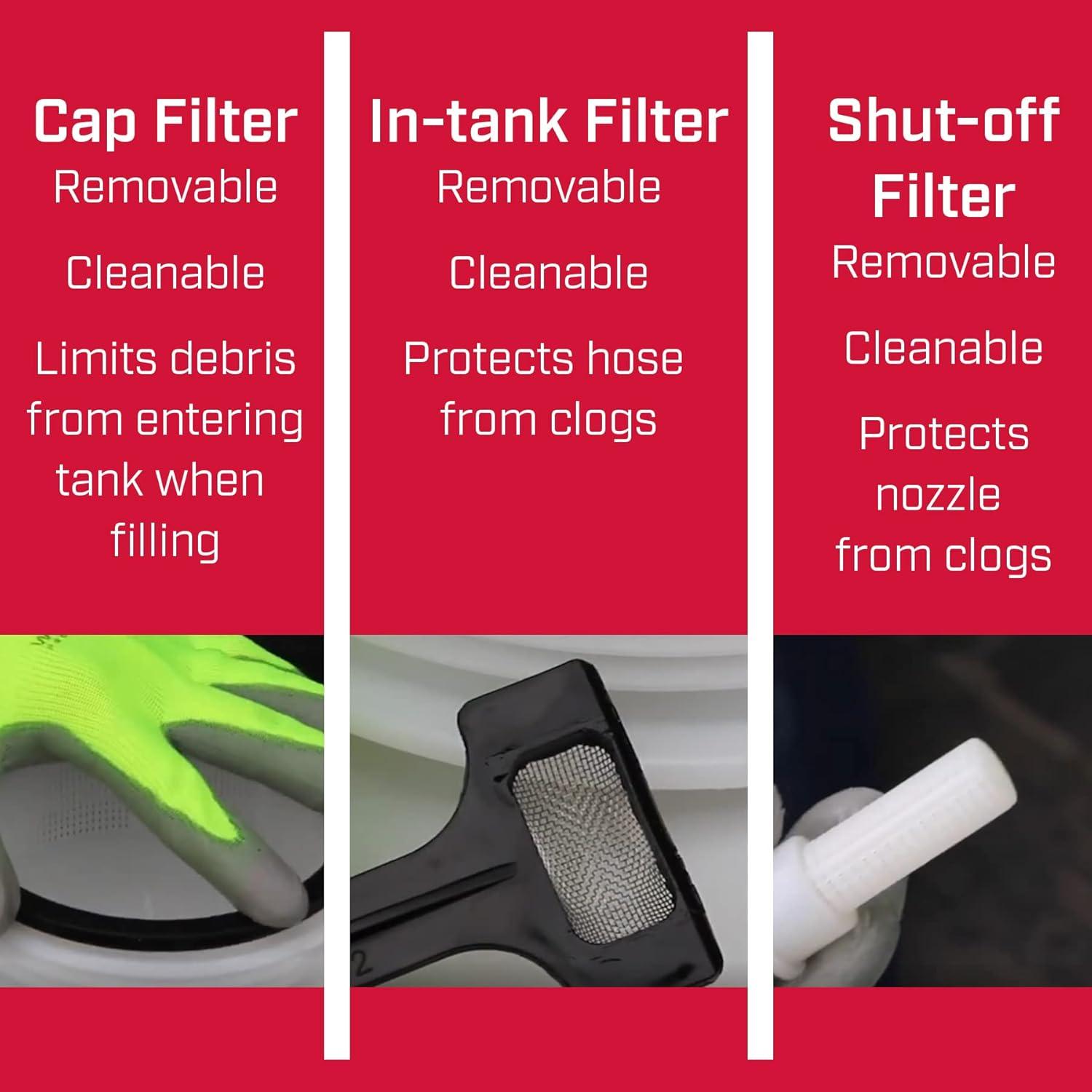 3-STAGE STANDARD FILTRATION SYSTEM: one filter is located in the shut-off, one inside the tank, near the pump, and the other as a basket with the tank cap; 3 different locations to catch debris before it clogs up your sprayer while working