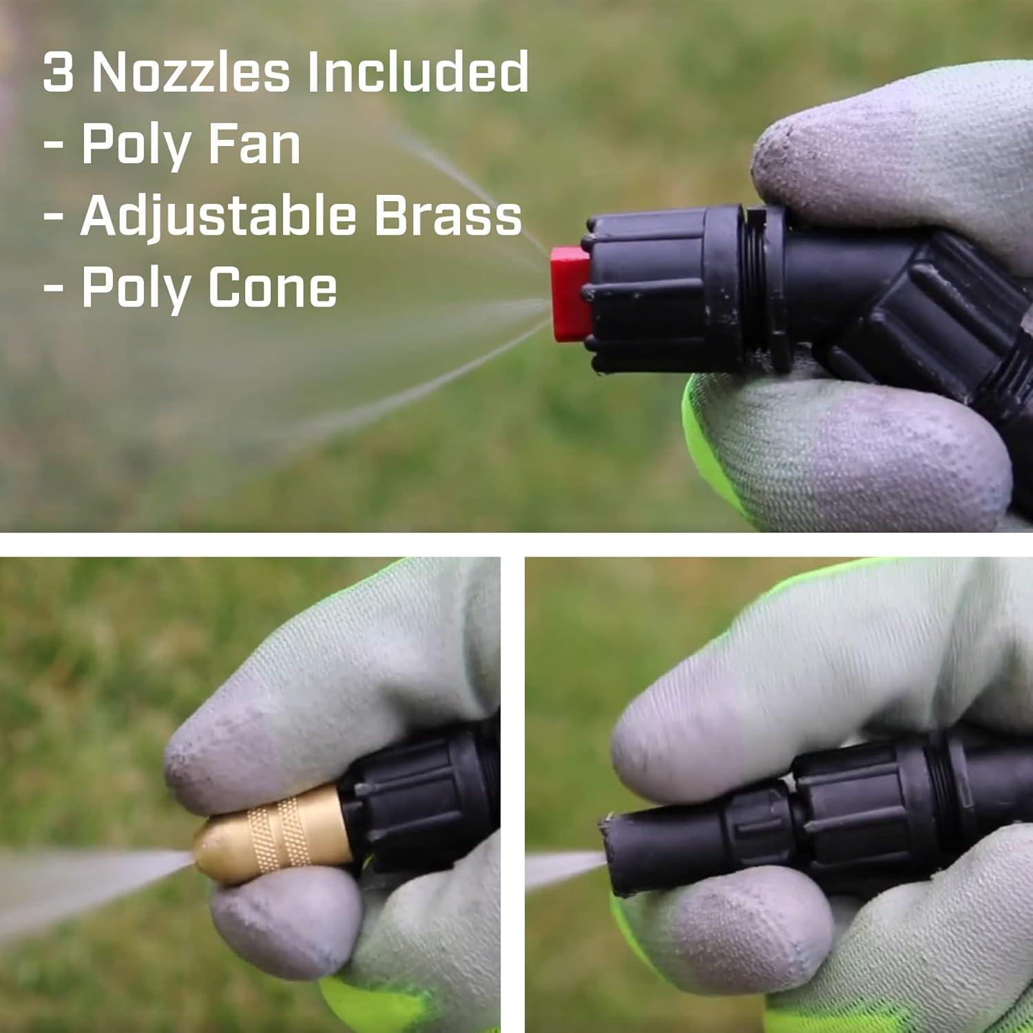 THREE SPRAY NOZZLES INCLUDED: dial your spray from coarse stream to shower with either the brass or poly nozzles, spray a fan with the poly fan tip spray nozzle