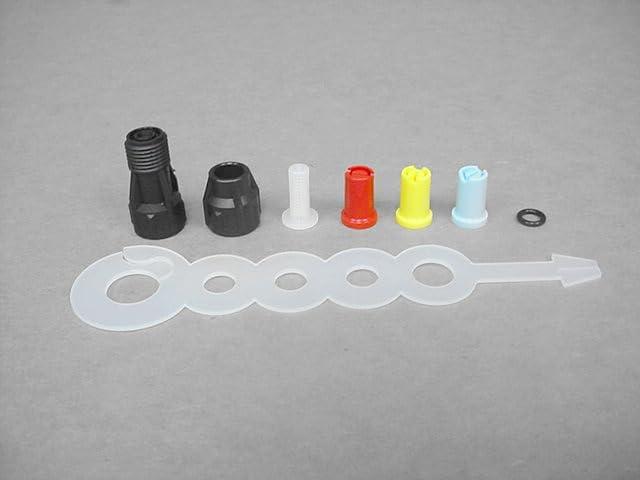 This kit replaces your fan, featuring 3 color-coded nozzles (red: 0.25 gpm, blue: 0.3 gpm, yellow: 0.5 gpm), connectors, and an O ring. It fits all poly Chapin 1/2″ wands.