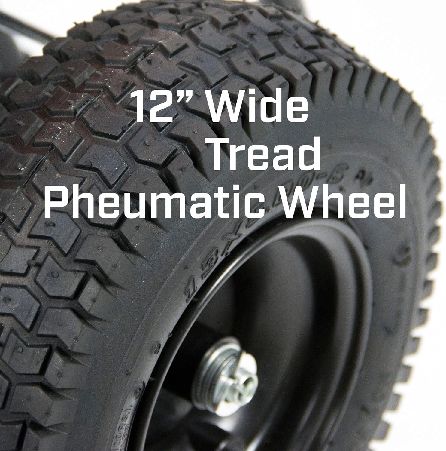 TIRES AND ACCESSORIES: 12-inch pneumatic, wide-tread tires move over uneven ground; rain/snow cover and grate included
