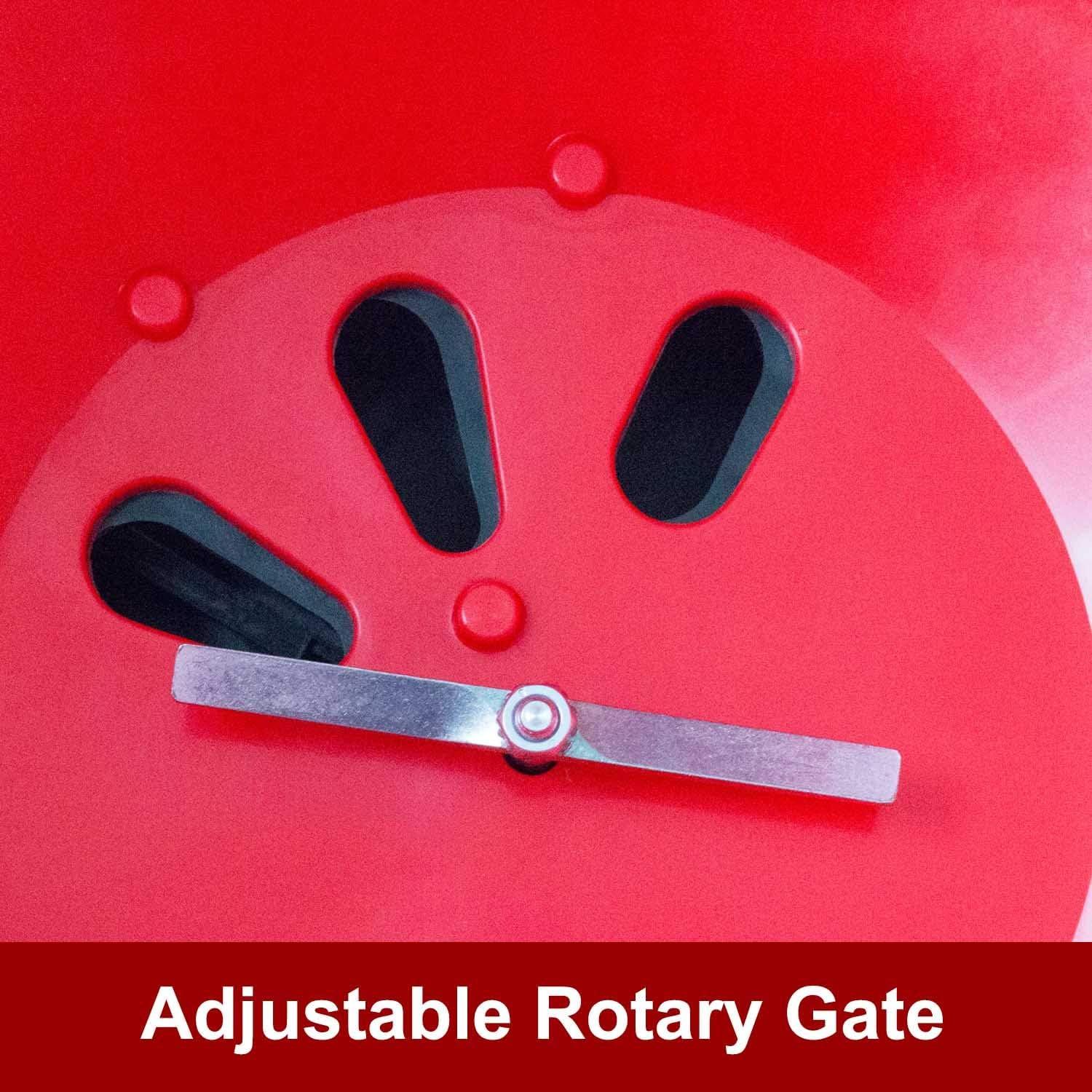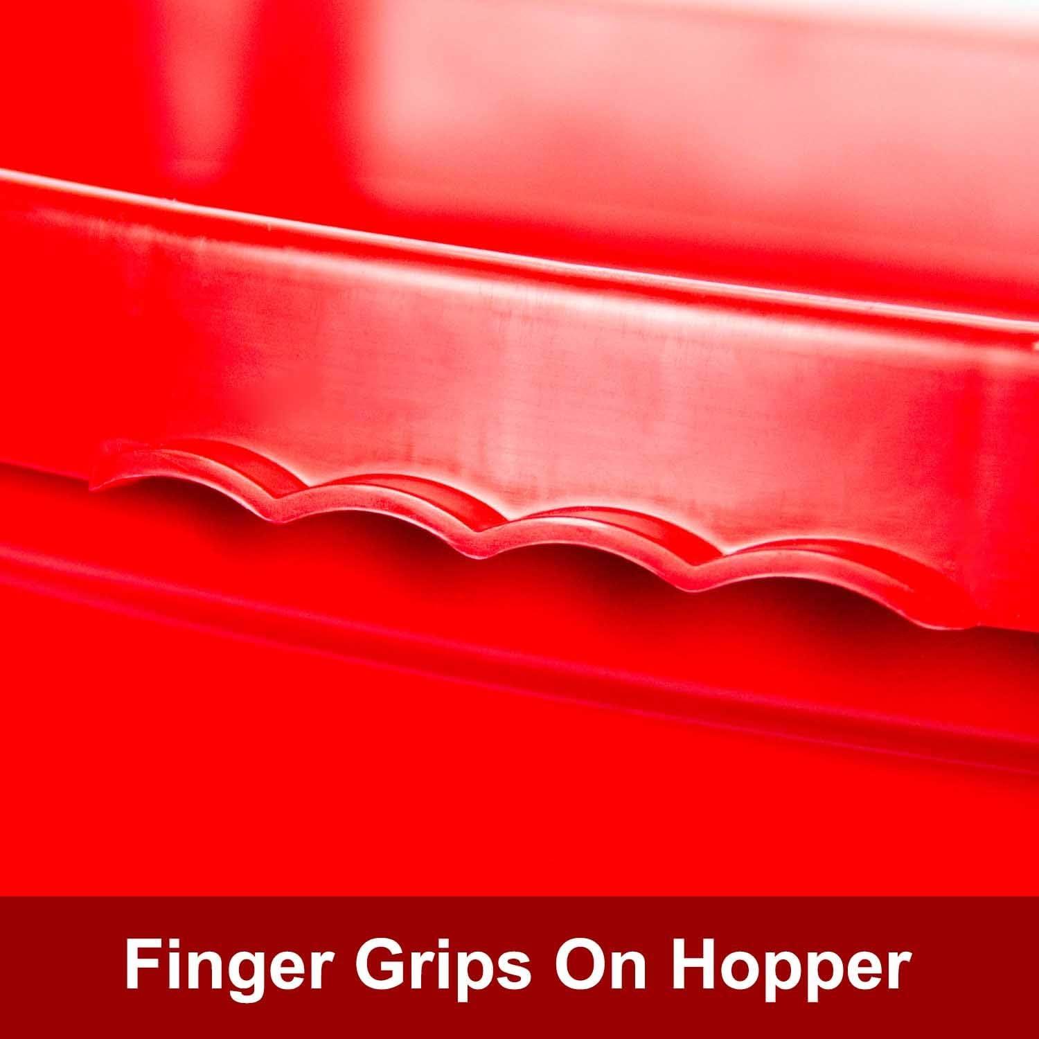 80-POUND CAPACITY HOPPER: weather and rust-resistant, red, 1-piece poly is supported on a stainless-steel frame; enclosed gearbox products it from weather and a grease fitting minimizes friction; rain cover and hopper grate are included