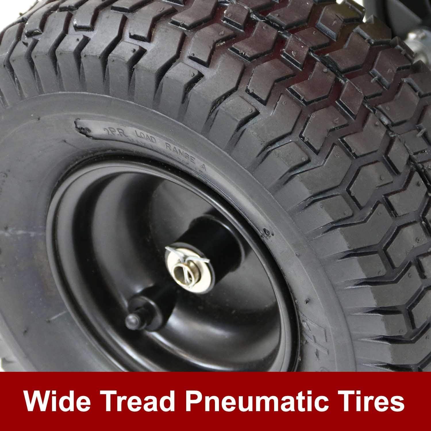 14-INCH PNUEMATIC TIRES: designed to handle uneven ground, acreage, and lawns